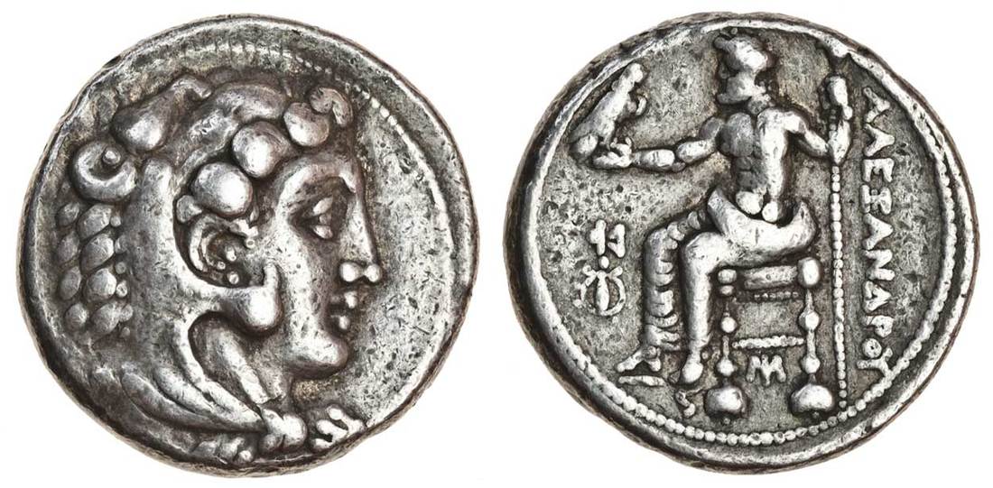 (x) Kingdom of Macedon, Alexander III, the Great (336-323 BC), AR Tetradrachm, 17.09g, Myriandros, head of young Herakles right, wearing lion's skin headdress, rev. Zeus enthroned left, holding eagle and sceptre, monogram and club within wreath on left, mi monogram below throne (Price 3230), very fine