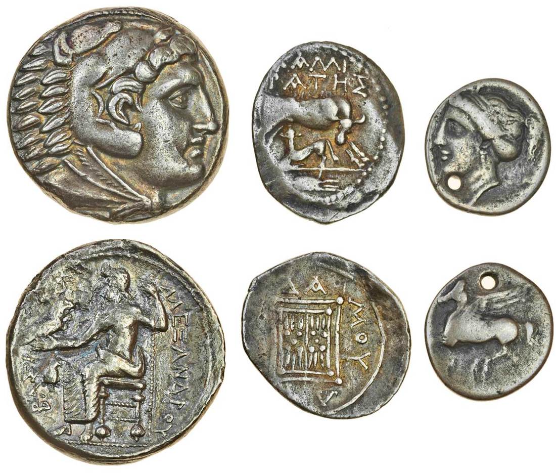 Kingdom of Macedon, Alexander III, the Great (336-323 BC), AR Tetradrachm, 16.05g, Amphipolis, head of young Herakles right, wearing lion's skin, rev. Zeus enthroned left, holding eagle and sceptre, Phrygian helmet on left (Price 112), erosion on left of reverse, good very fine, reverse very fine, together with a Drachm of Illyria, Apollonia (late 2nd-early 1st cent. BC), cow suckling calf right, magistrate's name above, rev. double stellate pattern within linear square, magistrate's name around, a little off centre, very fine, and a Drachm of Corinth (c.350-300 BC), Pegasos flying left, rev. head of Aphrodite left (cf. BMC 81), pierced, fine (3)