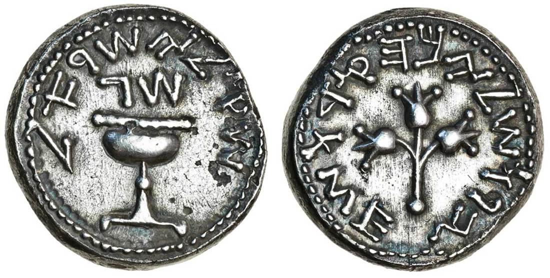 The Jewish War (66-70 CE), AR Shekel, 14.15g, year 3 (April 68-May 69), ritual chalice with pearled rim, Hebrew legend "shekel of Israel" and date "year 3", rev. staff with pomegranate buds, Hebrew legend "Jerusalem the holy" (Hendin 5th ed. 1361, 4th ed. 662; AJC 18), about extremely fine