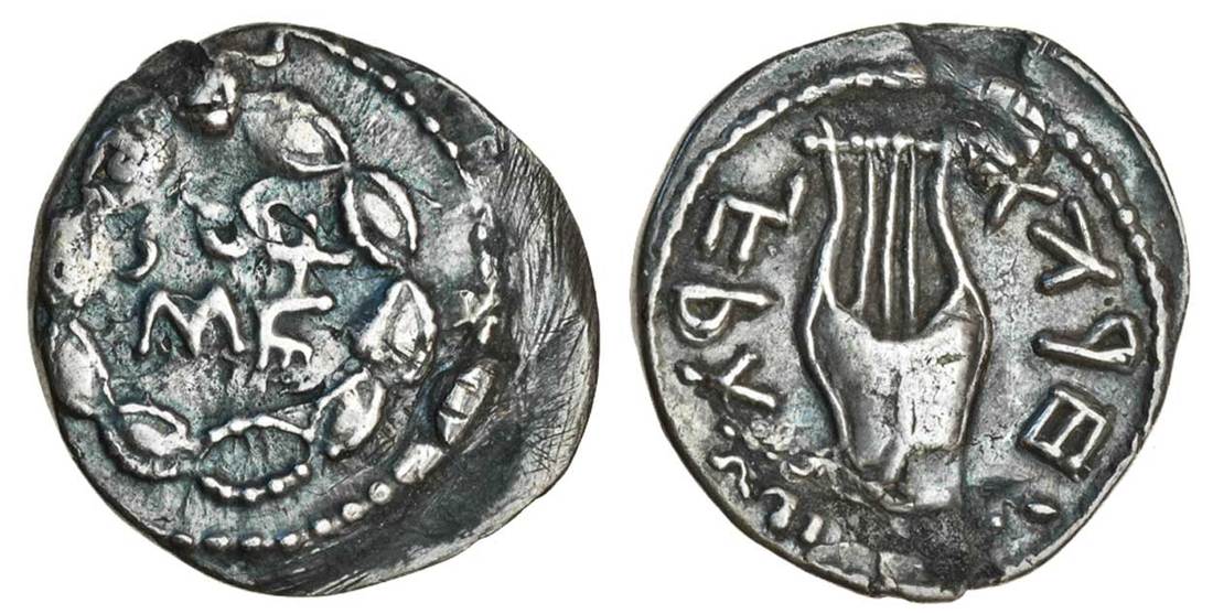 Bar Kochba Revolt (132-135 CE), AR Zuz, 3.00g, attributed to year 3 (134/135), Hebrew legend "Simon" within wreath, rev. elongated lyre, Hebrew legend "for the freedom of Jerusalem" (Hendin 4th ed. 718, 5th ed. 1419; AJC 55), very fine