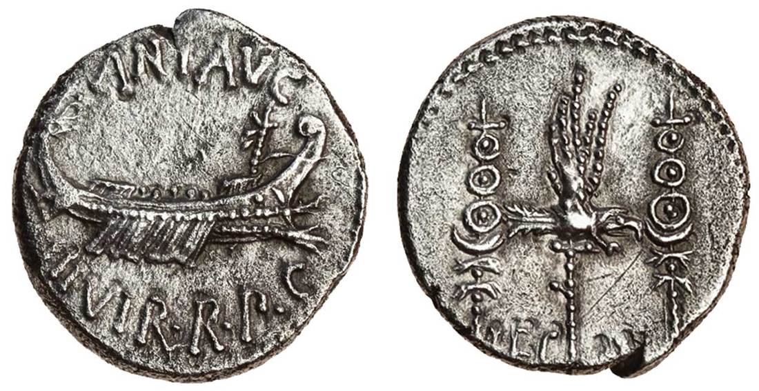 Mark Antony, AR Denarius, Patrae, 32-31 BC, galley, ant avg iii vir r p c, rev. leg ii, legionary eagle between two standards (RRC 544/14; Sydenham 1216), good very fine