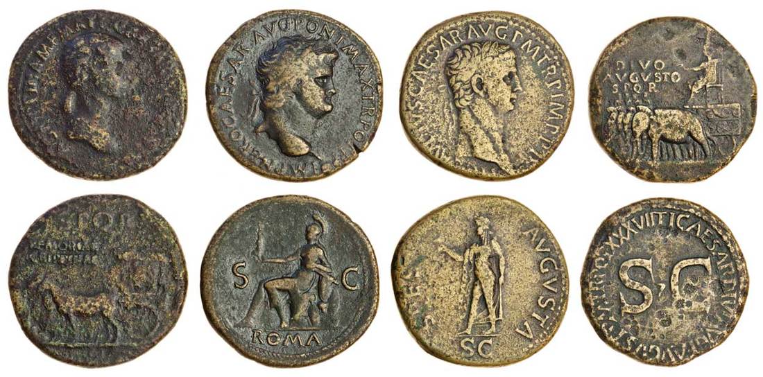 Julio Claudian Sestertii, of Tiberius, 35-36, seated statue of Augustus on ornamented car drawn by four elephants, rev. legend round large s c (RIC 62; BMC 108), Caligula, in honour of his mother Agrippina, 37-41, draped bust of Agrippina right, rev. carpentum drawn by two mules (RIC 55; BMC 81), Claudius, 42, laureate head right, rev. Spes walking left (RIC 115; BMC 192), and Nero, Lugdunum, 66, laureate head right, globe at point of bust, rev. Roma seated left (RIC 516; BMC 327), fine to good fine (4)