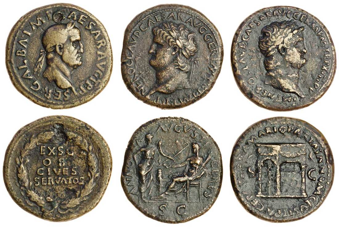 First Century Sestertii, of Nero, Rome, laureate head right, rev. temple of Janus with closed doors (RIC 353; BMC 113), another, Lugdunum, laureate head left, rev. Ceres seated left before Annona standing right, modius on altar between them (RIC 389; WCN 404), good fine to almost very fine, and Galba, Rome, laureate head right, rev. ex s c / ob / cives / servatos in wreath (RIC 385; BMC 63), pierced and partly plugged, almost very fine (3)