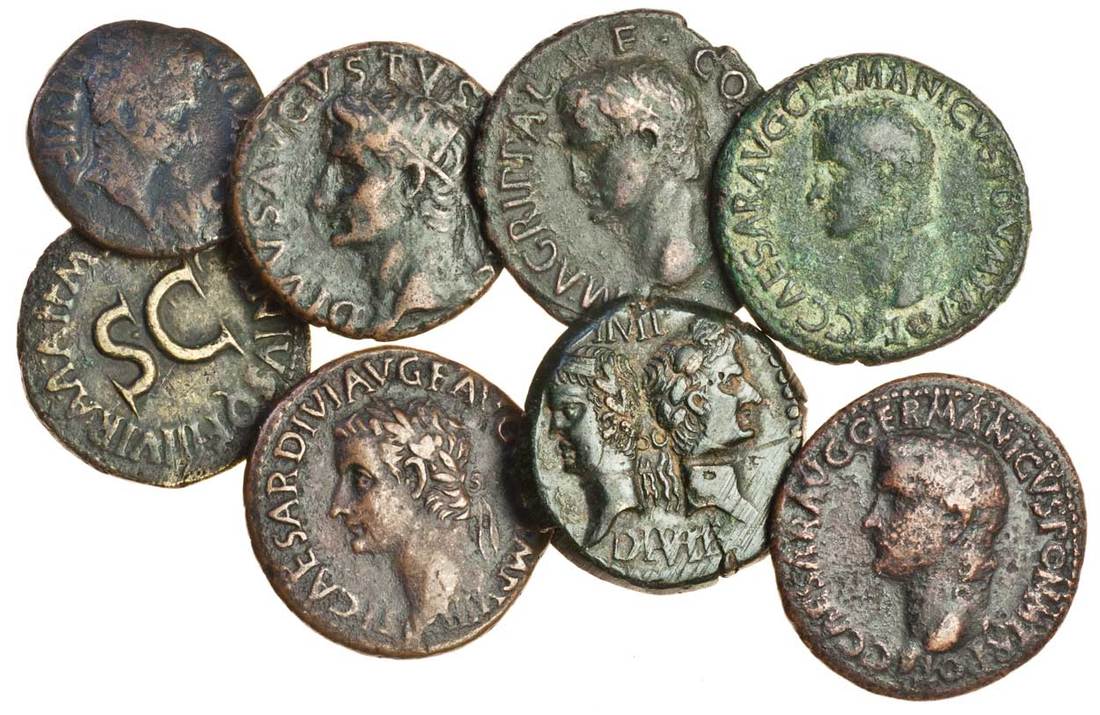Julio-Claudian Second Brass; Augustus, Dupondius, c.17 BC, moneyer M. Sanquinius (RIC 342), a Semis of Carthago Nova in Spain (RPC 168), an As of Nemausus, heads of Augustus and Agrippa back to back, rev. crocodile and palm branch (RPC 524), Divus Augustus, As, 22/3, radiate head left, rev. altar (RIC 81), Agrippa, As, 37-41, rev. Neptune standing (RIC 58), Tiberius, As, 35/6, laureate head left, rev. winged caduceus (RIC 58), and two Asses of Caligula, 37/8, bare head left, rev. Vesta seated left (RIC 38), good fine to almost very fine (8)