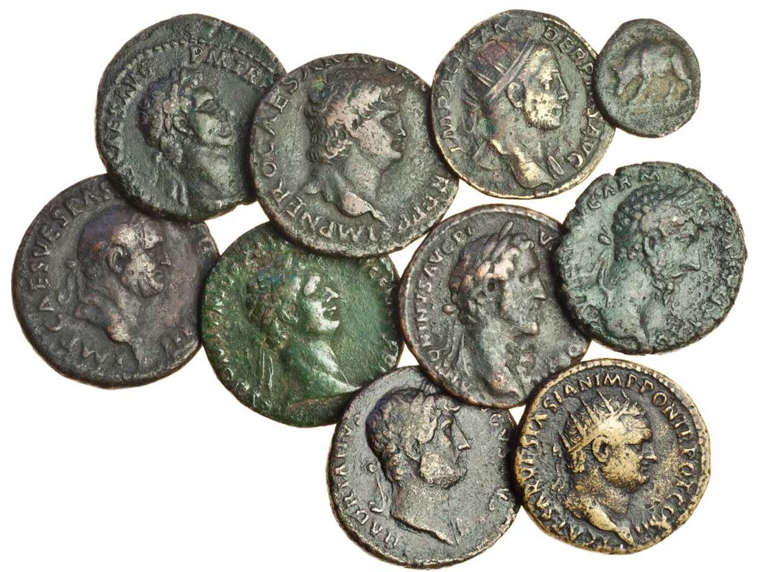 First and Second Century Second Brass; Nero, As, bare head right, rev. Victory flying left (RIC 543), Vespasian, As, 71, laureate head right, rev. eagle standing on globe (RIC 322), Titus, Dupondius, 72, radiate head right, rev. Felicitas standing left (RIC 465), Domitian, As, laureate head right, rev. Virtus standing right (cf. RIC 709), a Quadrans, 84/5, rhinoceros left (RIC 250), Nerva, As, 97, laureate head right, rev. Fortuna standing left ( RIC 77), Hadrian, As, 125-128, laureate bust right, rev. galley (RIC 673), Antoninus Pius, As, 143/4, laureate head right, rev. two ancilia - oval shields with projections (RIC 736), Lucius Verus, As, 166, laureate head right, rev. Victory erecting trophy (RIC 1448), and Severus Alexander, Dupondius, 232, radiate bust right, rev. Spes walking left (RIC 649), fine to almost very fine (10)