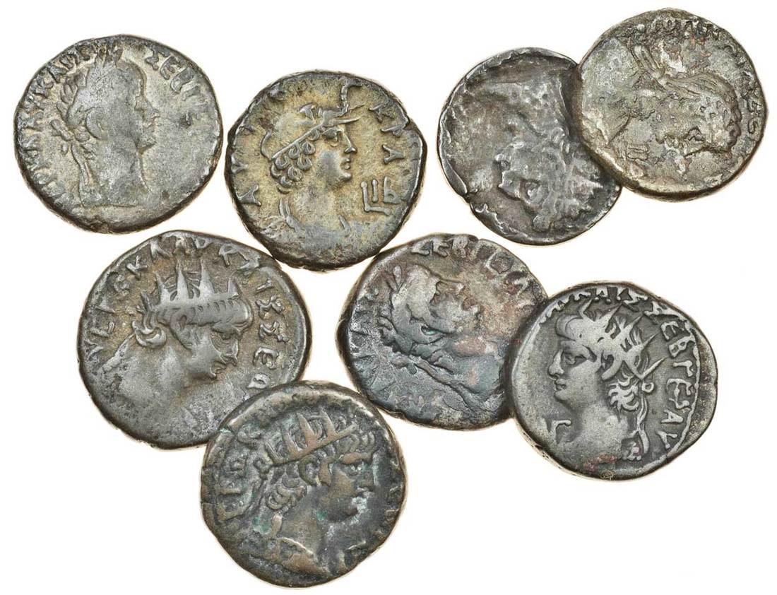 Nero (AD 54-68), Roman Alexandria, Billon Tetradrachms (8), AD 56-57, laureate head right, rev. serpent Agathodaemon (BMC 171 var.), similar bust, rev. draped bust of Agrippina (BMC 116), AD 63-64, radiate bust right, rev. bust of Sarapis right, modius on head (BMC 156), AD 64-65, similar bust, rev. eagle standing left (BMC 165), similar bust, rev. draped bust of Poppaea (BMC 124), AD 65-66, similar bust, rev. bust of Alexandria with elephant's scalp headdress (BMC 163), AD 66-67, radiate bust left, rev. radiate head of Augustus right (BMC 112), and similar bust, rev. laureate head of Tiberius right (BMC 114), good fine to very fine (8)