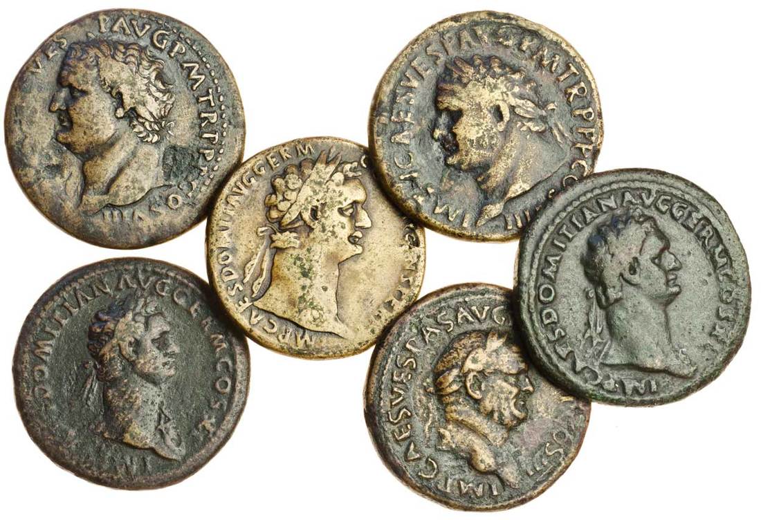 Flavian Sestertii, of Vespasian, Rome, 71, laureate head right, rev. Mars advancing right (RIC 247; BMC 568), Titus, Rome, 80-81, laureate head left, rev. Annona standing left, modius with corn ears before, stern of ship on right (RIC 136; BMC 152), another, similar bust, rev. Spes standing left, holding flower (RIC 170; BMC 183), Domitian, Rome, 95-96, laureate head right, rev. Jupiter seated left (RIC 794; BMC 474), and another, 85, bust as last, aegis at neck, rev. kneeling German captive presenting shield to Domitian standing left (RIC 279; BMC 299), another, similar bust, rev. Domitian sacrificing over altar before shrine containing cult statue of Minerva (RIC 277; BMC 296), good fine to almost very fine, some with light smoothing or tooling (6)