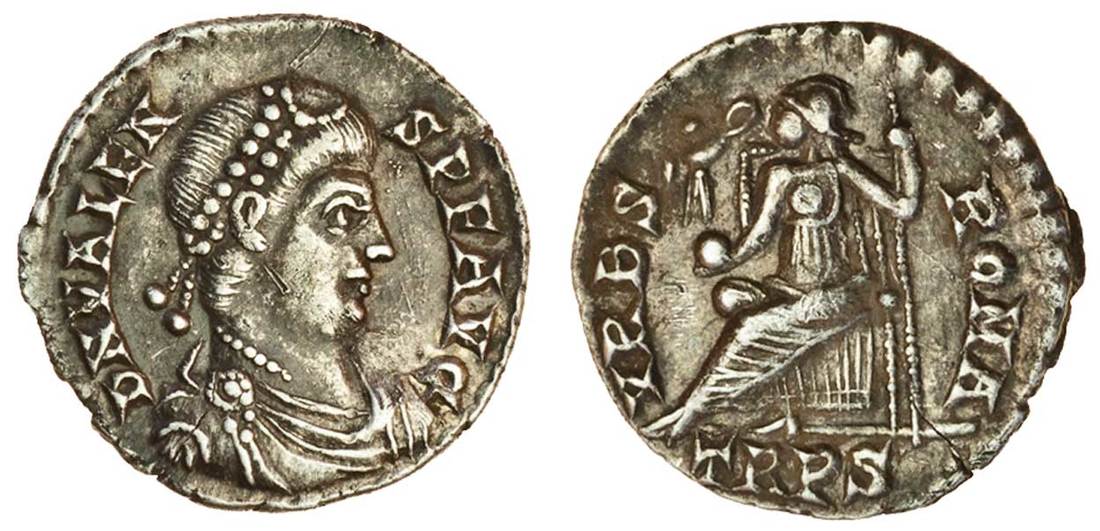 Valens (AD 364-378), AR Siliqua, Trier, 375-378, pearl-diademed, draped and cuirassed bust right, d n valen-s p f avg, rev. vrbs roma, Roma seated left on throne, holding Victory on globe, and spear, trps in exergue (RIC 27e; RSC 109†b), very fine