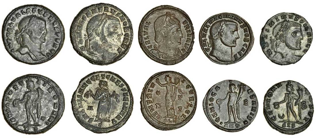 Fourth century Folles (5), of Galeria Valeria, Alexandria, diademed, draped bust right, rev. veneri victrici, Venus standing left (C. 2), Severus II (306-307), as Caesar, Carthage, laureate head right, rev. Carthage standing facing, head left, holding fruits in both hands (RIC 40a), another, as Augustus, Cyzicus, similar bust, rev. genio popvli romani, Genius standing left (RIC 25b), Maximinus II, Daza (309-313), as Caesar, Antioch, similar bust, rev. genio caesaris, Genius standing left (RIC 87a), and another as Augustus, Siscia, similar bust, maximinvs fil avgg, rev. genio avgvsti, Genius standing left (RIC 200a), almost very fine to extremely fine (5)