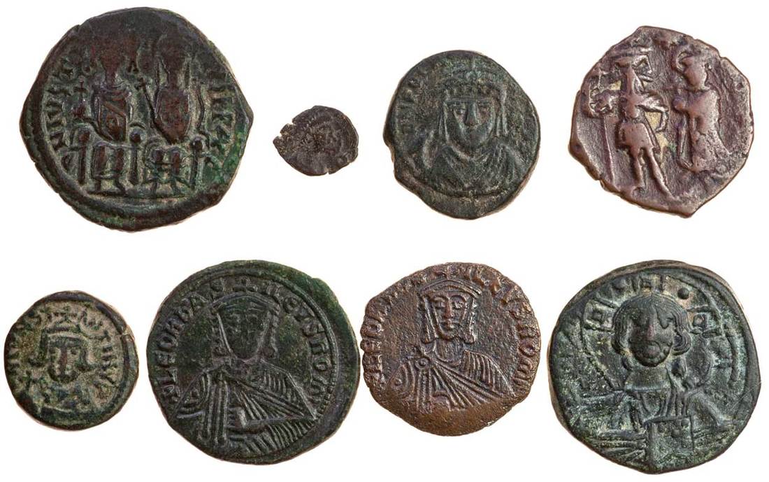 Byzantine bronze coins (8), comprising a Follis of Justin II and Sophia, Nicomedia, 570/571, (Sear 369), a Half Follis of Focas, Carthage, 632/633 (Sear 685), a Follis of Heraclius and Heraclius Constantine, Constantinople, 663/664 (Sear 810), a Half Follis of Constans II, Carthage, 643-647 (Sear 1057), a Follis of Leo VI, Constantinople (Sear 1729), another similar on a reduced flan, an anonymous Follis (type B) attributed to Romanus III (1028-34), (Sear 1823), together with an AE4 of Leo I (AD 457-474), good fine to almost very fine (8)