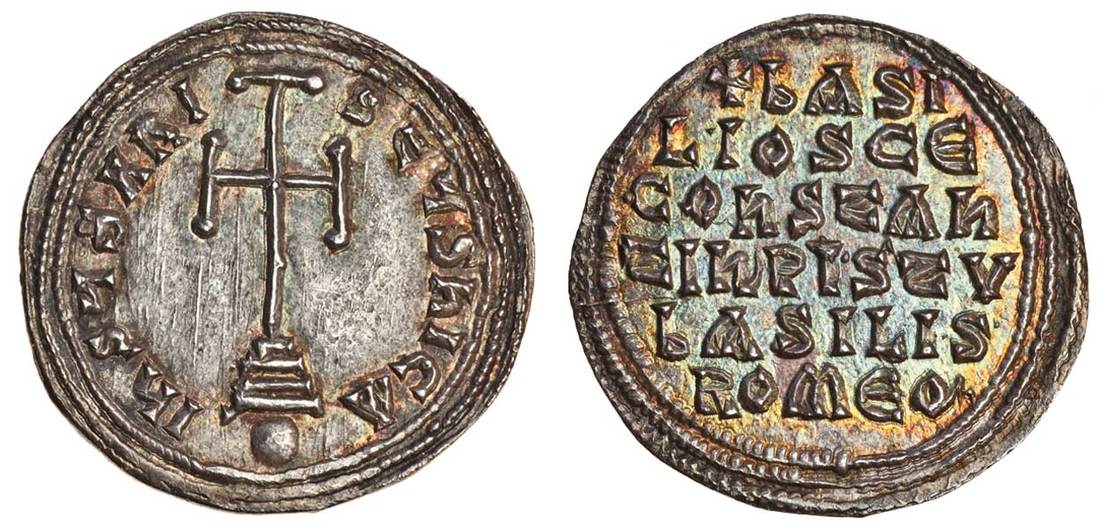 Basil I, with Constantine (AD 867-886), AR Miliaresion, Constantinople, cross potent on three steps, globe beneath, ihsus xpistus nika, rev. +basi / lios ce / constan / tin pistv / basilis / romeo in six lines within triple border (Sear 1708; DOC 7), iridescent toning, extremely fine