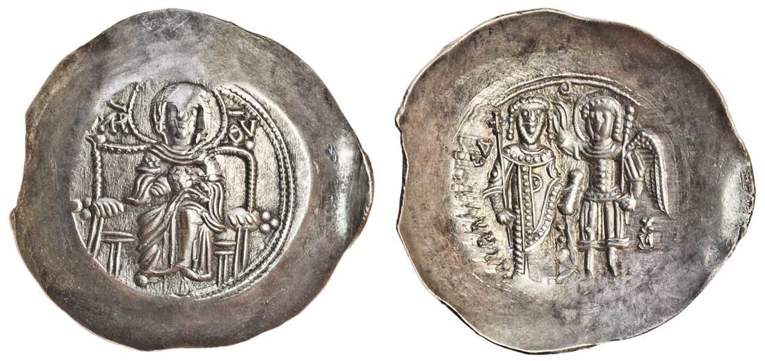 Isaac II, Angelus (AD 1185-95), Electrum Trachy, 4.43g, the Virgin enthroned facing, rev. Isaac standing facing, being crowned by the Archangel Michael standing facing on right (Sear 1976; Hendy pl.20, 7), good very fine