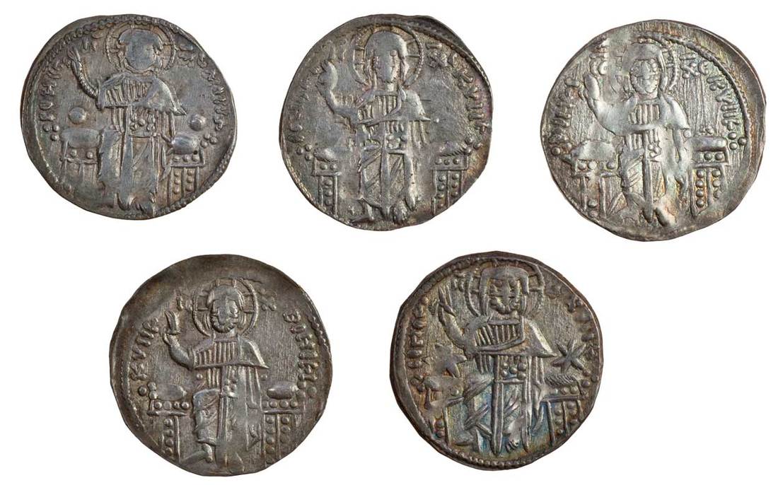 Andronicus II and Michael IX (1295-1320), AR Basilikon, Constantinople, Christ enthroned facing, rev. the emperors standing facing, holding labarum between them (Sear 2402; LPC p.88, 35; Whitting, Num. Circ. 1972), three others, similar, and another with stars above arms of throne (cf. Sear 2402 and LPC, 35; Whitting, Num. Circ 1972, p.270 and 324), almost very fine to very fine (5)