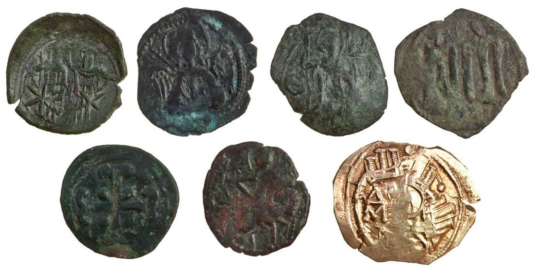 Andronicus II and Michael IX (1295-1320), AV Hyperpyron, 4.45g, the Virgin orans within city walls, M on left, rev. the two emperors kneeling facing, being crowned by Christ standing between them (Sear 2396), the usual weakness, very fine, an AE Trachy, Thessalonica, large six-pointed star, rev. Michael being crowned by Andronicus, stars either side (Sear 2457 var.), another with Andronicus alone (Bendall & Donald 14), an AE Assarion, Constantinople, facing bust of Archangel Michael, rev. figures of the emperors being crowned by Christ between them (Sear 2435), a Tetarteron (B&D 46), Andronicus III (1328-1341), Assarion, Thessalonica, emperor standing facing, rev. cross fleury (Sear 2481; LPC p.126, 13), and a Stamenon, emperor on horseback right, rev. St Demetrios on horseback right (Sear 2499;LPC p.243, 15), fair to about very fine (7)