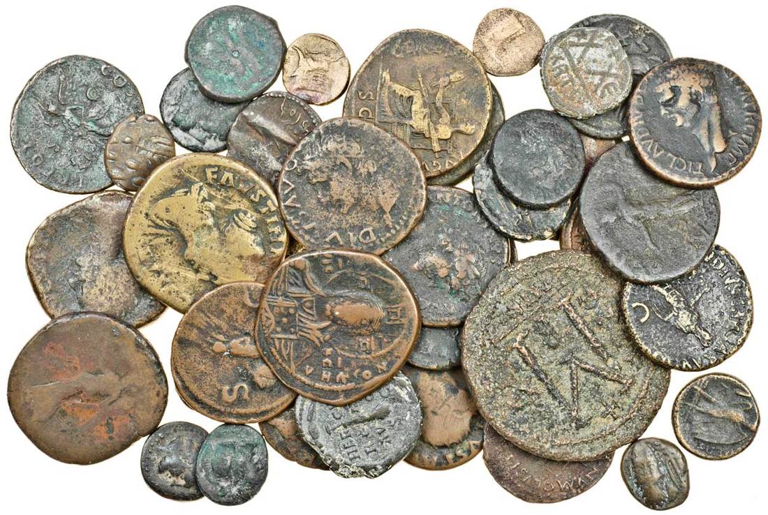 Roman bronzes (20), Republican Semuncia, second brass of Divus Augustus (3), Tiberius, Claudius (2), Antonia, Nero (2), Vespasian (2), Trajan, Antoninus Pius, Commodus (wearing lion's skin, rev. club), and Sestertii of Marcus Aurelius, Faustina Jnr (3), Otacilia Severa, about fine to almost very fine, together with Byzantine Folles (3) and a Half-Follis, fair to good fine, an Ostrogothic Follis of Theoderic, bust of Roma right, rev. eagle standing left, head right, xl on left, in exergue, good fine, reverse good very fine, and miscellaneous Greek bronzes (13), about fine to good fine (38)