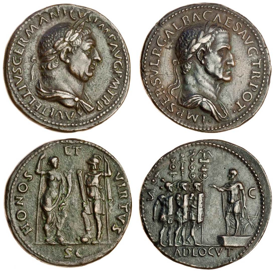 Paduan copies (2), after Cavino, of Sestertii of Galba, rev. Galba addressing soldiers (Klawans 4), and Vitellius, rev. Honos and Virtus standing facing each other (Klawans 1), almost extremely fine (2)