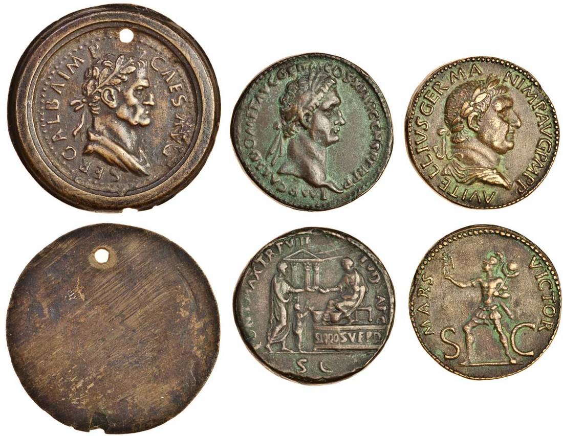 Paduan cast copies (2), after Cavino, of Sestertii of Vitellius, rev. Mars Victor left, and Domitian, rev. Domitian seated on platform before temple, extending hand to togate citizen, a child beside him (Klawans 5), together with a uniface pierced copy of a Galba Sestertius set in a brass collar, very fine to about extremely fine (3)