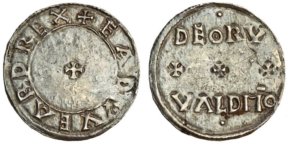 Edward the Elder (899-924), Penny, 1.62g, two-line type, Deorwald, +eadvveard rex around small cross pattée in centre, rev. deorv/ald mo, moneyer in two lines divided by three small cross pattées, pellet above and below (N.649; S.1087), better than very fine, scarce
