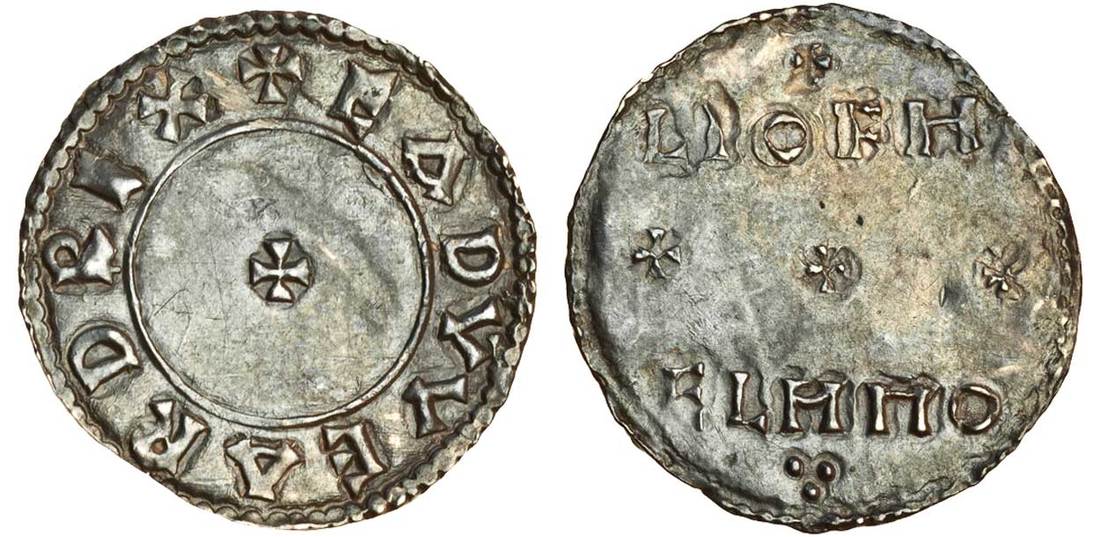 Edward the Elder (899-924), Penny, 1.44g, two-line type, Liofhelm, +eadvveard rix (sic) around small cross pattée in centre, rev. liofh/elm mo, moneyer in two lines divided by three small cross pattées, trefoil of pellets above and below (N.649; S.1087), a scuff in the obverse legend to the left of the initial cross and lamination from 1-2 o’clock, darkly toned, good very fine, scarce