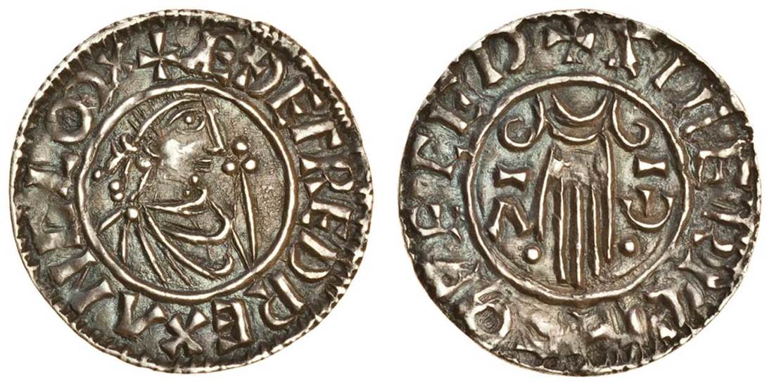 Aethelred II (978-1016), Penny, 1.13g, second hand type, Watchet, Sigeric, bust right, rev. +sigeric m-o peced, hand of providence between alpha and omega issuing from clouds that billow outward (N.768; S.1146), dark tone, good very fine, extremely rare