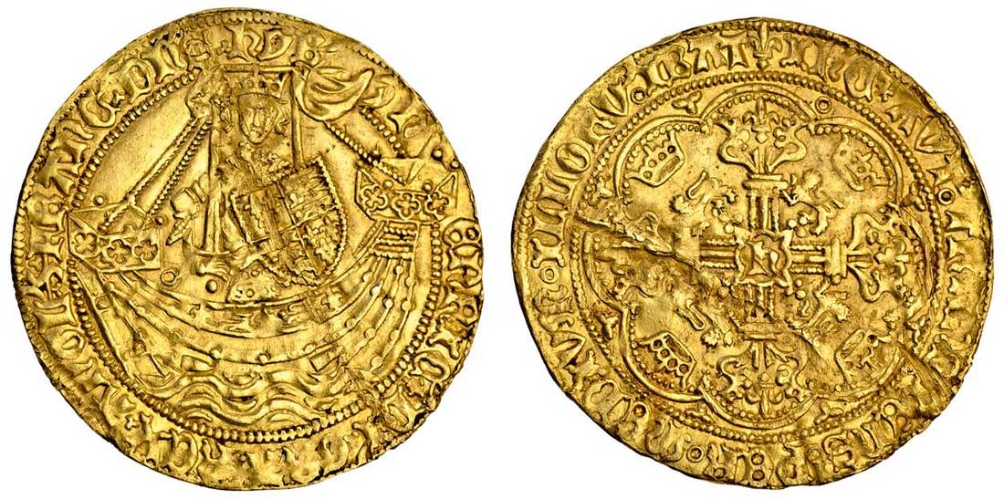 Henry VI, first reign (1422-61), annulet issue, 1422-c.1430, Noble, 6.95g, i.m. lis on reverse, King standing facing in ship, holding sword and shield, annulet by sword arm, rev. cross fleury, h in centre (S.1799), badly creased and straightened, fine