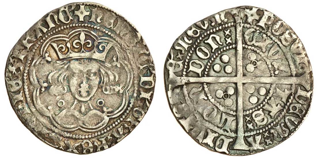 Henry VI, first reign (1422-61), Groat, 3.72g, Annulet issue, Calais/London mule, m.m. pierced cross both sides, facing bust, annulets by neck, rev. civitas london, three pellets in each angle, with an annulet in the first and third angles (N.1424/1423; S1835/1834; Stewartby p.324, Ib2), soft in parts, good fine to nearly very fine, very rare