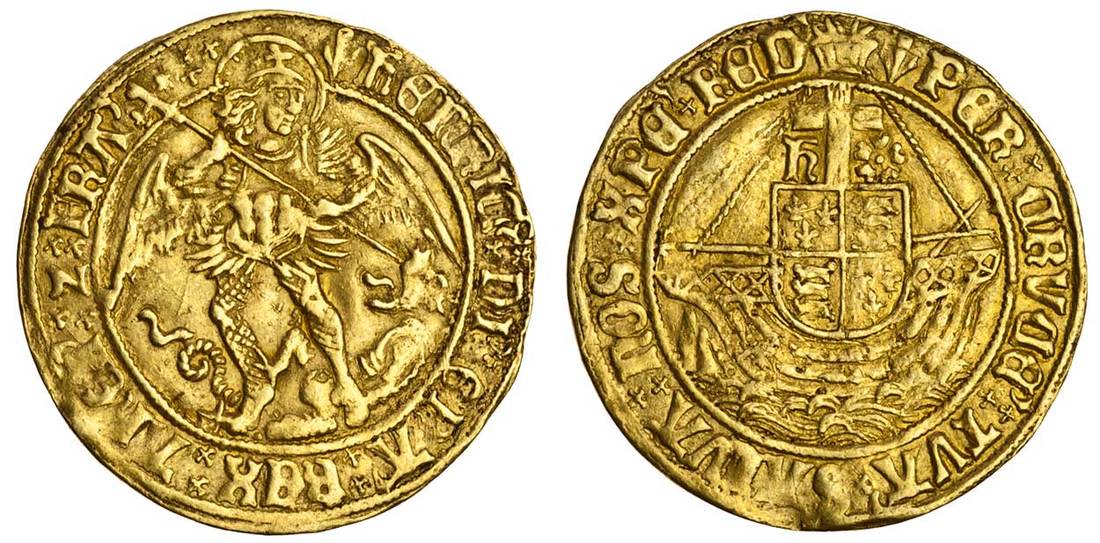 Henry VII (1485-1509), Angel, 5.07g, class V, m.m. pheon, henric di gra rex ange z fra, St Michael vanquishing Satan, rev. per crucem tva salva nos xpe red, cross dividing h and rose above shield within ship, double saltire stops (N.1698; S.2187), obverse legend double-struck, slight weakness at 8 o'clock and at corresponding place on reverse, very fine