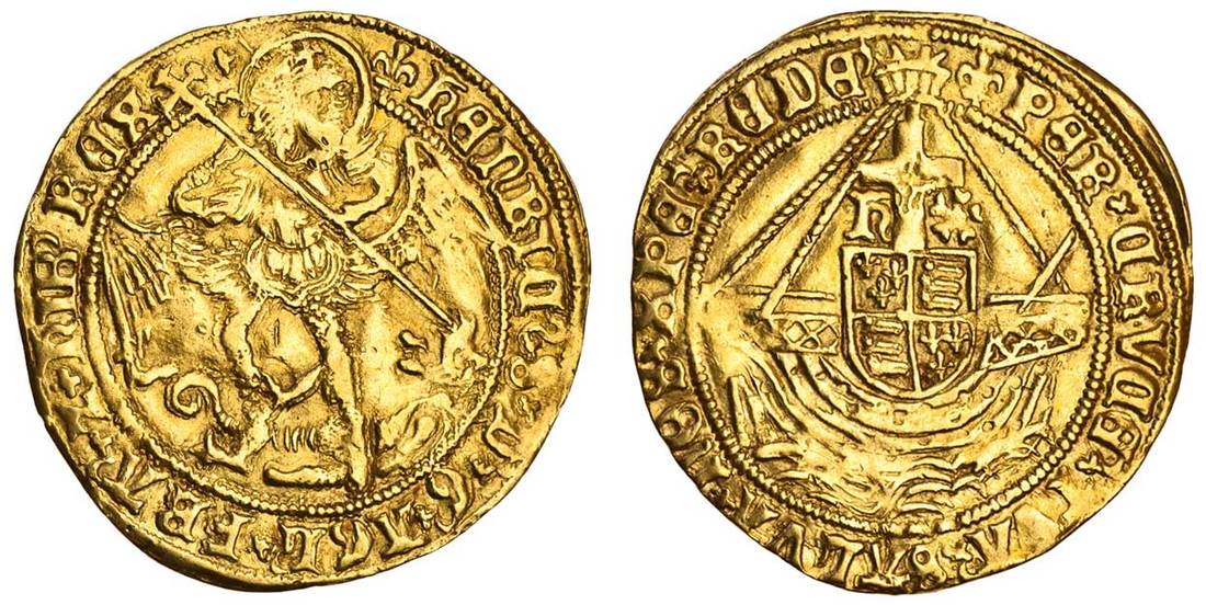 Henry VIII (1509-47), third coinage, 1544-47, Angel, 5.07g, Tower, m.m. lis, St Michael vanquishing Satan, rev. h and rose over shield in ship (N.1830; S.2300; Schneider 623), slight weakness on St Michael’s head and the ship, a pleasing nearly very fine, the reverse better, scarce