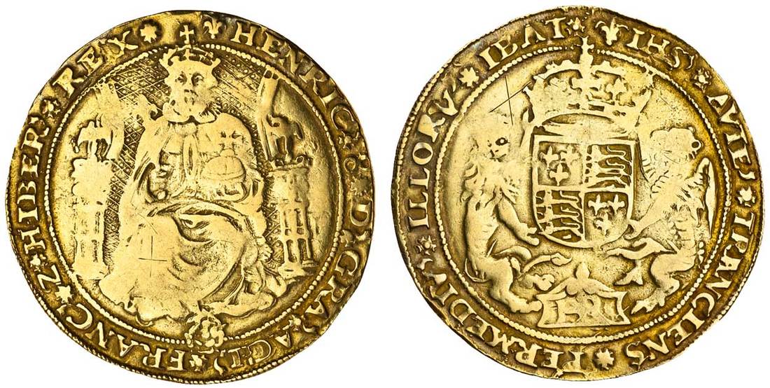 Edward VI (1547-53), in the name of Henry VIII, Sovereign, 12.25g, 1547-51, Tower, m.m. lis, crowned King seated facing on throne, holding sceptre to left and orb to right, rose below, rose stops, Roman lettering, rev. crowned shield with supporters, hr monogram in cartouche, (N.1863; S.2389; Schneider 642, Whitton pl.1/2), a light cross scratched to both sides with general wear, the legends quite well struck, fine to very fine, very rare
