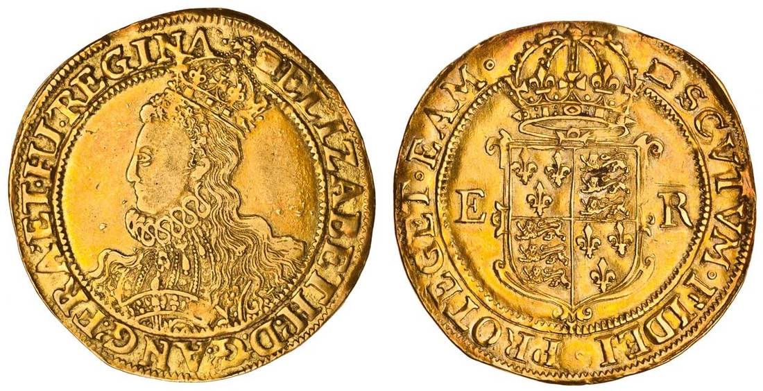 Elizabeth I (1558-1603), sixth issue, 1583-1600, Pound, m.m. woolpack, elizabeth.' d.' g.' ang'. fra.' et. hi.' regina., crowned bust left with long hair and richly ornamented dress, rev. scvtvm. fidei proteget. eam., crowned shield dividing e-r, annulet stops on reverse (Schneider 799; N.2998; S.2534), about very fine