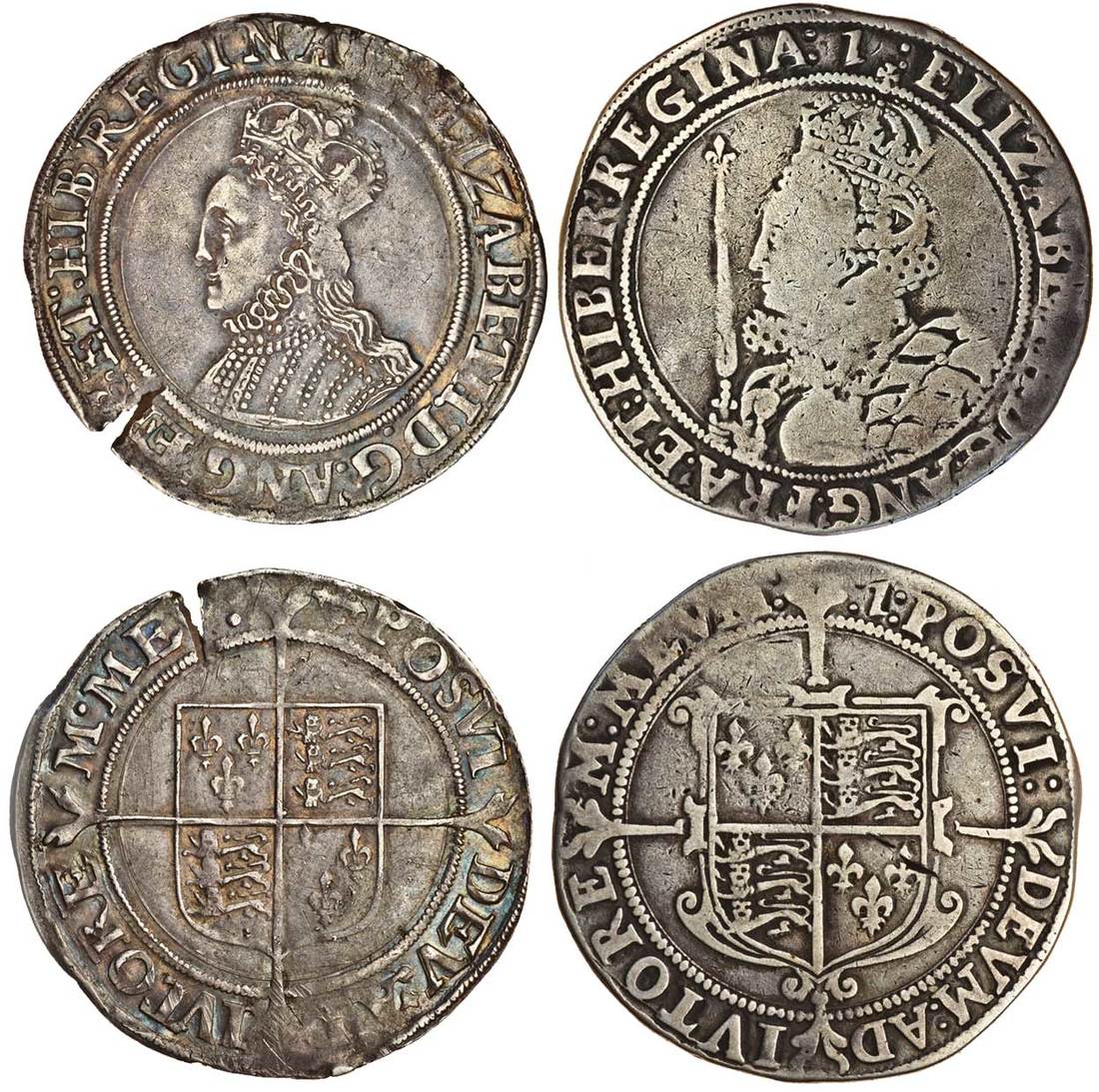 Elizabeth I (1558-1603), Shilling, 5.87g, second issue, m.m. cross crosslet, bust 1A left, rev. square topped shield over long cross fourchée, Halfcrown, 14.45g, seventh issue, m.m. 1, bust holding orb and sceptre to left (N.1985, 2013; S.2555A, 2583), the first with a striking split, otherwise almost very fine, the obverse better, the second worn, fair/about fine (2)