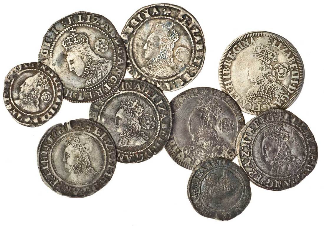 Elizabeth I (1558-1603), Sixpences (5), 2.72g, 1561, small flan, m.m. pheon, 2.73g, 1574, m.m. eglantine (obv. over ermine), 2.94g, 1601, m.m. 1, milled issue (2), m.m. star, 1561, 2.83g, small bust, large rose, 1562, 2.97g, tall decorated bust, Groats (2), first issue, 2.02g, m.m. lis, second issue, 1.98g, m.m. cross crosslet, Threepences (2), 1575, 1.34g, m.m. eglantine, 1578, 1.42g, m.m. Greek cross, near fine to almost very fine, a good group (9)