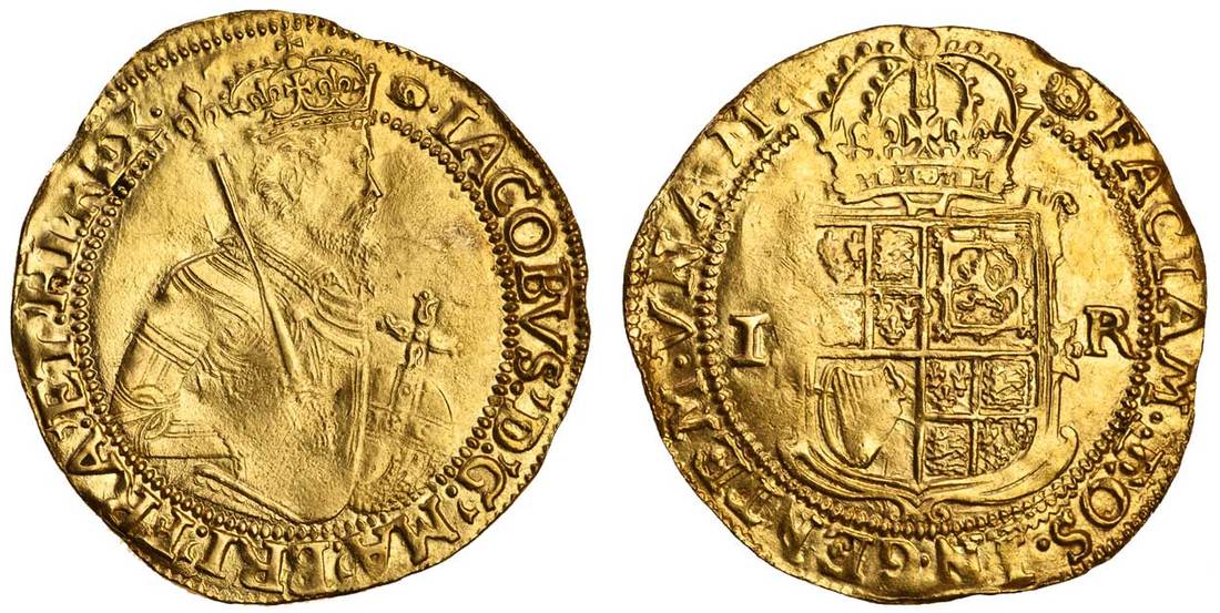 James I (1603-25), second coinage, 1604-19, Unite of 22 shillings, 9.80g, m.m. tun, fifth bust, rev. square topped shield dividing i r, crown above (N.2085; S.2620; Schneider -), the obverse weakly struck with a few trivial hairlines, otherwise very fine or better in parts