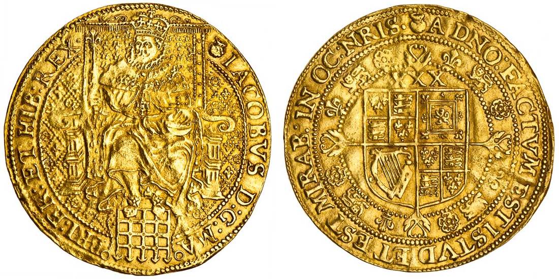 James I (1603-25), third coinage, Rose Ryal, 12.51g, m.m. thistle, iacobvs d: g: ma bri: fr: et hib: rex, King enthroned holding orb and sceptre, back of throne garnished with semée of thistles, portcullis at feet, rich pattern of roses and lis in field, rev. a dno: factvm est istvd et est mirab: in oc: nris, shield over cross fleury, value xxx above, within circle decorated with lis, lions and roses (N.2108; S.2632), slightly creased, about very fine, rare