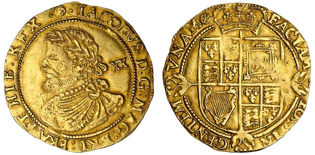James I (1603-25), Laurel, m.m. rose, second laureate bust left, rev. crowned shield over long cross fourchée (S.2638), metal weakness where creased and straightened, otherwise good very fine