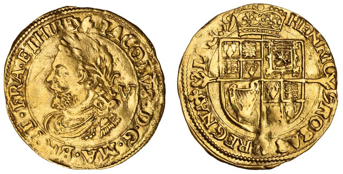 James I (1603-25), third coinage, 1619-25, Quarter-Laurel, 2.25g, m.m. trefoil, wire-line inner circle, ties form a bracket, rev. long cross fourchée over square topped shield, crown above (N.2119; S.2642A; Schneider 100), hairlines to the obverse, almost very fine