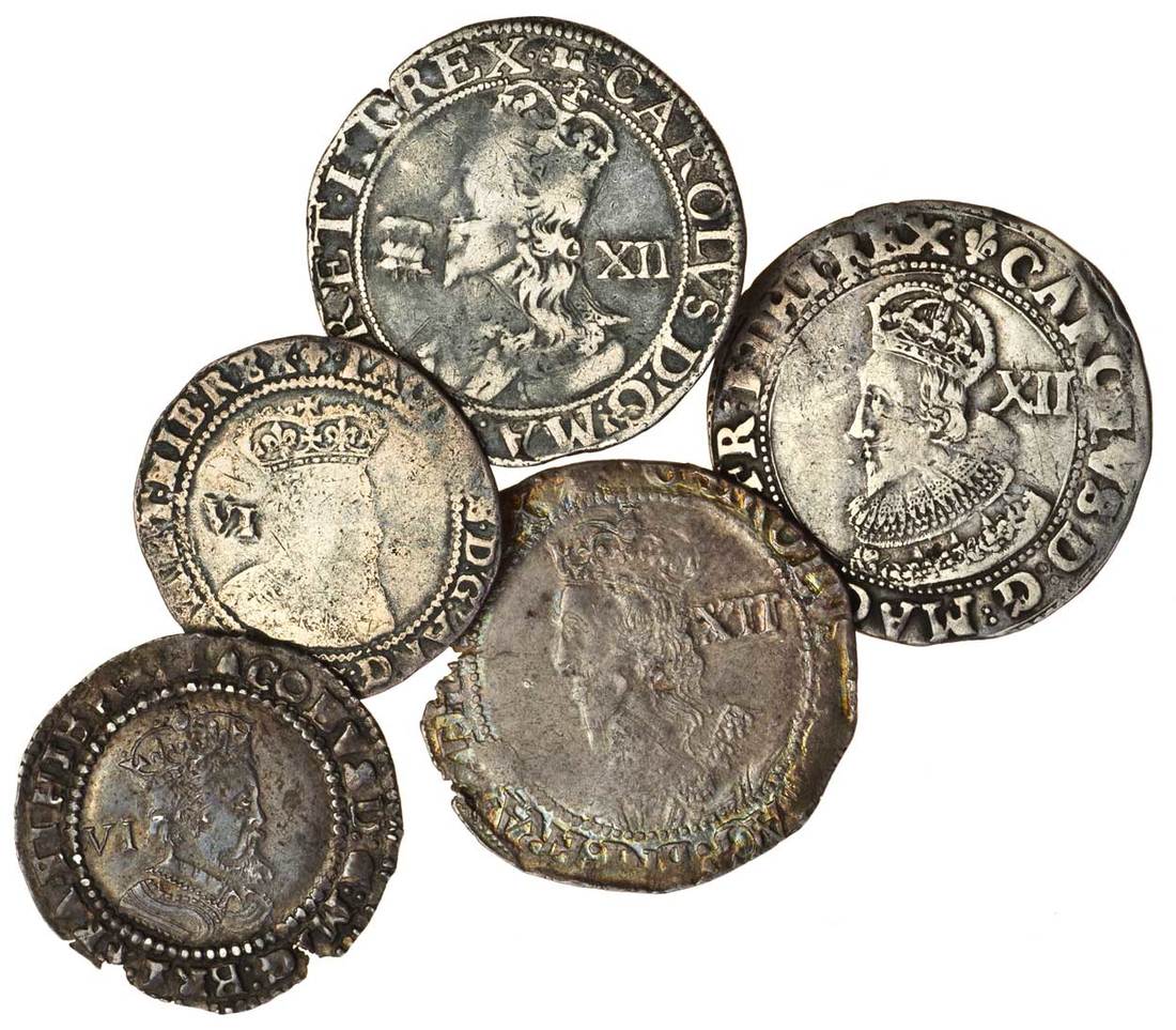 Image depicted on website is incorrect - there are only three coins in this lot. The two smaller King James coins at bottom left are NOT included in this lot.