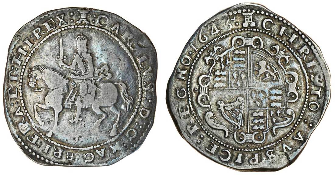 Charles I (1625-49), Crown, 26.81g, Exeter, 1645, m.m. tower, King on horseback left, rev. oval garnished shield (N.2561; S.3062; Besly dies D22), irregular, nearly very fine
