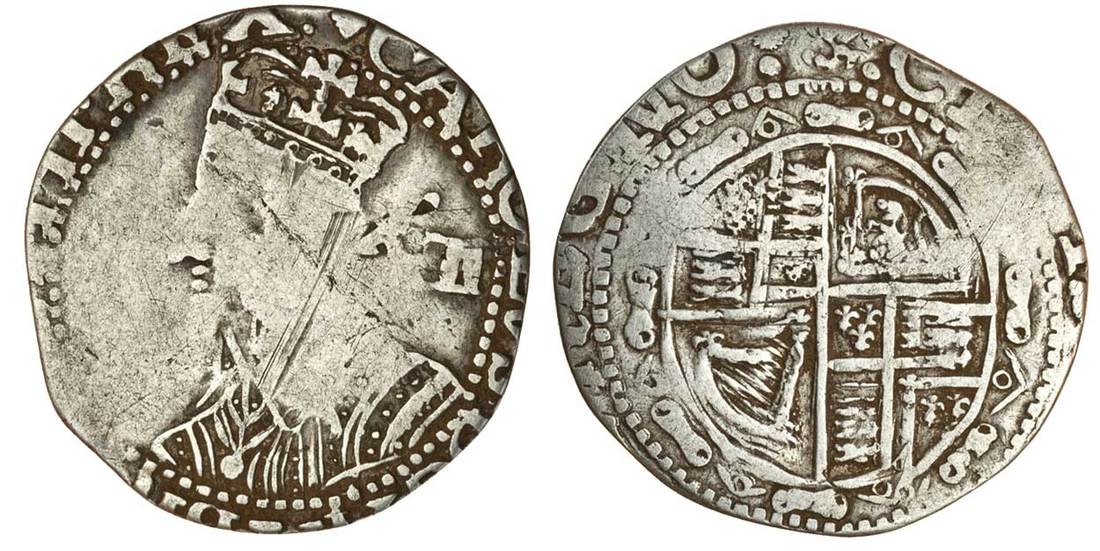 Charles I (1625-49), Shilling, 4.23g, W/SA mints (probably Worcester), m.m. lis/helmet, crude crowned bust left, rev. oval garnished shield (N.2617; S.3110; Allen D15), clipped with a scratch across the bust, fine, very rare