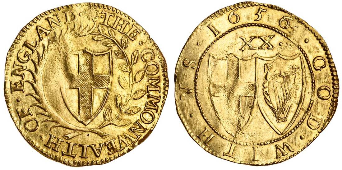Commonwealth (1649-60), Unite, 8.98g, 1656, m.m. sun/-, shield of St George within wreath formed of a palm and laurel branch, rev. conjoined shields of St George and Ireland, mark of value above (N.2715; S.3208; Schneider 344), tiny digs by the A of england, very fine, scarce