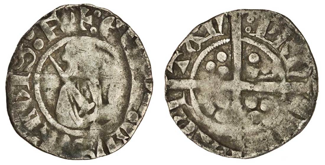 Anglo-Gallic, Edward the Black Prince (1362-72), Sterling, 0.78g, second issue, Figeac, half-length bearded bust right holding sword, f at end of legend on obverse, two pellets before legend, rev. prn cps aqi tan, long-cross dividing legend, three pellets in each angle (Elias 190 var.; WF 210-6/f; S. 8133), about fine