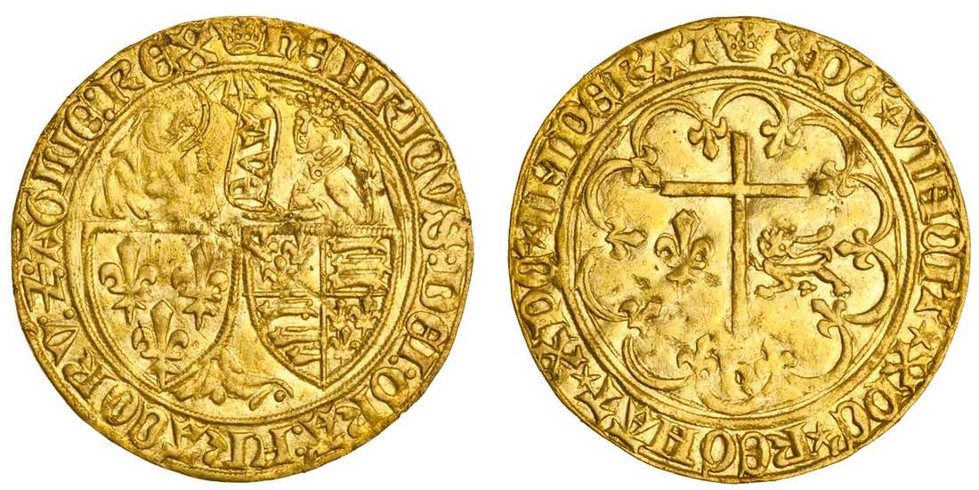Anglo Gallic, Henry VI (1422-61), Salut d’or, 3.46g, Paris, half length figures of the Virgin Mary and angel Gabriel, AVE on scroll between, French and English royal arms below, rev. Latin cross, h below, lis and lion at sides (S.8164), scrapes on the left obverse and weak at the bottom of the reverse, very fine