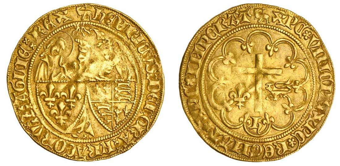 Anglo Gallic, Henry VI (1422-61), Salut d’or, 3.48g, Amiens, half length figures of the Virgin Mary and angel Gabriel, ave on scroll between, French and English royal arms below, rev. Latin cross, h below, lis and lion at sides (S.8164), soft in parts, good fine to nearly very fine