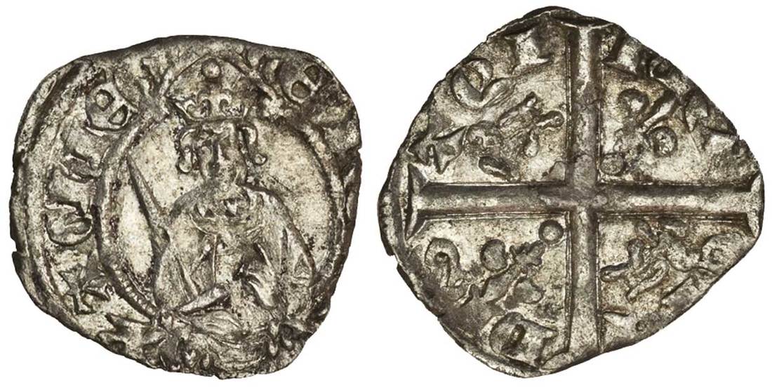 Anglo-Gallic, Henry IV-VI (1399-1453), Hardi d'argent, 1.07g, half-length crowned bust facing, holding sword in right hand and raising left, beneath canopy, pellet above crown, rev. fra cie dns aqi, long cross dividing legend, leopards and lis in angles (Elias 233; WF 282B-9a; S.8147) very fine, a very scarce reverse legend