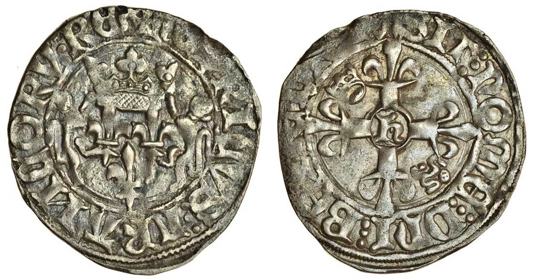 Anglo-Gallic, Henry V (1415-22), Florette, 3.076g, third issue, Rouen, henricvs: francorv: rex:, crown with lion supporters above three fleurs-de-lis, rev. sit: nome: dni: benedictv, cross fleury, crown and lion in first and third angles, h in centre (E.248; Laf.4396; S.8158), good very fine