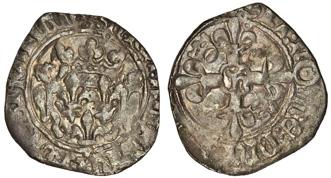 Anglo-Gallic, Henry V (1413-22), Florette, 2.23g, fourth issue, 16 June 1420, Rouen, crown over three fleur-de-lis supported by leopard rampant either side, rev. croix fleur-de-lisée, crown in first angle, leopard in fouth angle, annulet under first letters of legends on obverse and reverse (Elias 249a; WF 365B-2/a; S.8159), good very fine with attractive tone