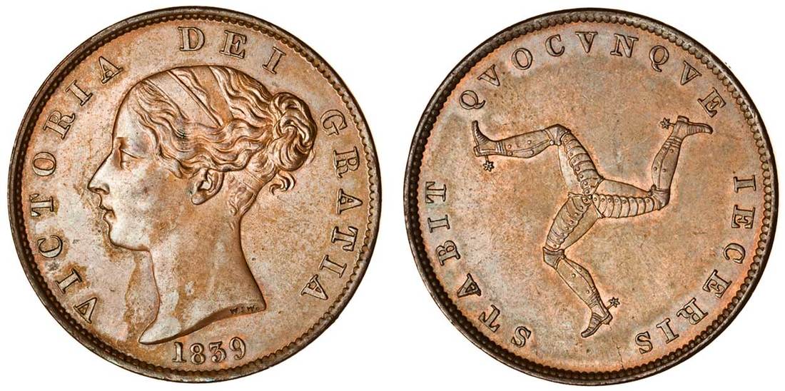 Isle of Man, Victoria (1837-1901), Halfpenny, 1839, filleted head left, date below, rev. qvocvnque ieceris stabit, triskelis (S.7418), friction to the hair, nearly extremely fine