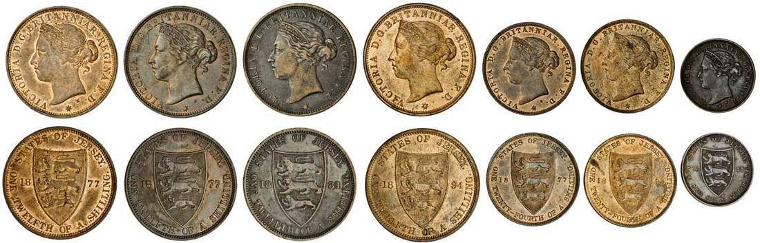 Jersey, Victoria (1837-1901), 1/12-Shillings (4), 1877H (2), one extremely fine with lustre, other good very fine, 1881, very fine, 1894, good extremely fine with lustre, 1/24-Shilling (2), 1877H, 1894, both extremely fine, 1/48-Shilling, 1877H, very fine (S.7006, 7007, 7008) (7)