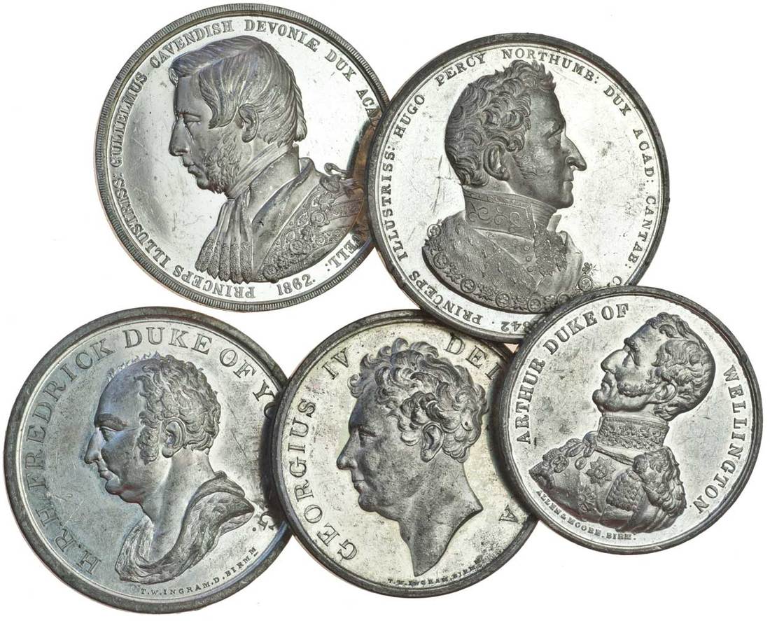 Nineteenth Century White Metal Medals (12), including Death of Frederick Duke of York, 1827, Death of George IV, 1830, Cambridge University, Installation of the Duke of Northumberland as Chancellor 1842, Death of the Duke of Wellington, 1852, Cambridge University, Installation of the Duke of Devonshire as Chancellor, 1862 (BHM 1278, 1376, 2056, 2480, 2713), very fine and better (12)