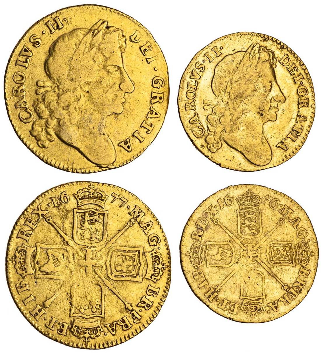 Charles II (1660-85), Guinea, 1677, fourth laureate bust right, rev. crowned shields cruciform, sceptres in angles, retrograde 1 in date, Half-Guinea, 1676, second laureate bust right, rev. crowned shields cruciform, sceptres in angles (S.3344, 3348), both fine (2)